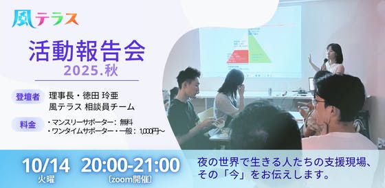 いつも風テラスの活動を支えてくださっている皆様、こんにちは!10月14日(火)20時~21時に、オンラインによる活動報告会を開催いたします! 「風テラスがどんな活動をしているのか、具体的に知りたい」「夜の世界で孤立・困窮している人たちが抱える課題について理解したい」「相談員が日々どんな思いで、...