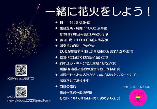 8/29の夜、浅草付近で手持ち花火の交流会を開催します。お申し込み・お問い合わせは↓のXのDMでお願いいたします。https://twitter.com/Arata_LGBTQ