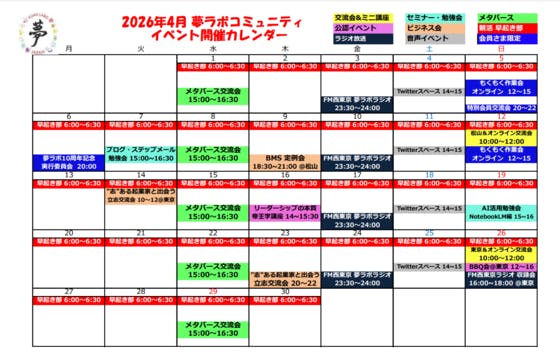 【2026年4月 夢ラボ開催スケジュール】夢ラボ コミュニティのイベント、勉強会、ミニ講座など各種開催一覧をアナウンス致します! ご参加・お問い合わせは、Facebookイベントへの参加ボタンか、主宰 田中歩に直接ご連絡ください。 夢ラボ特別会員様は、交流会すべて参加...