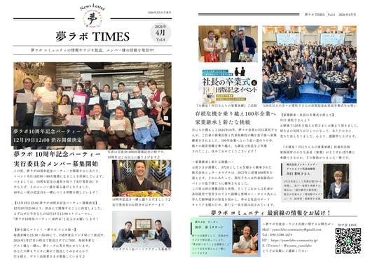 【夢ラボ コミュニティのニュースレター最新刊を発行しました!】2026年4月号 最新ニュースレターを公開します!夢ラボ コミュニティのイベントやラジオ放送、メンバー様のご活躍などを掲載いたしました。〜今号のポイント〜◇夢ラボ10周年記念パーティー開催日が決定◇10周年記念の実行委員メンバーを募...
