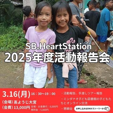 こんにちは!3/16(月)に2025年度SB.HeartStation活動報告会を開催いたします。SB.HeartStationの活動についてのお話しや、タイ、フィリピンミンダナオ島の手渡しツアーについてのご報告、ミンダナオ子ども図書館の子どもたちとのオンライン交流を予定しております。ボランテ...