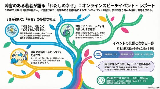 国際幸福デーに合わせて企画し、多様な障害を持つ8名の学生・若者が、自分らしい幸せの形や困難への向き合い方を独自の言葉で発信しました。参加した観覧者からは、登壇者の勇気ある自己開示や前向きな姿勢に対して、深い共感や感動のメッセージを多数お寄せいただきました。イベントは単なる発表に留まらず、相互理...
