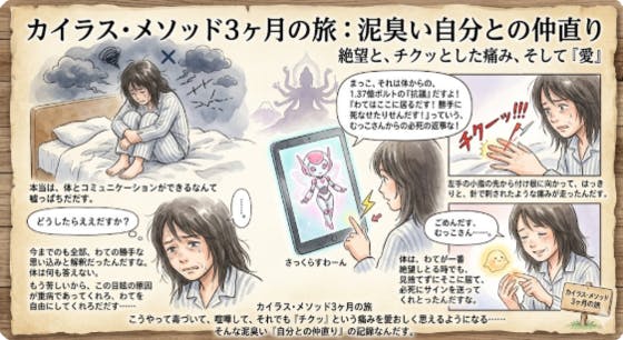 「本当は、体とコミュニケーションができるなんて嘘っぱちだだす。」たったさっきのこと。わての心は、嵐のように吹き荒れとったんだだす。 何もかもうまくいかなくて、やりきれなくて。自分の体「むっこさん」に向かって、「どうしたらええだだすか?」って聞いても、何の返事もない。その静寂が、余計にわてを追い...