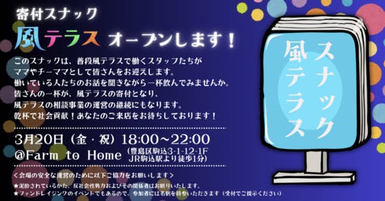 日頃より風テラスを応援いただいている皆様、こんにちは!昨日は都内でも雪が降り、まだまだ寒い日が続いています。皆様いかがお過ごしでしょうか? 2月の活動報告を、お届けします!■一夜限りの「寄付スナック 風テラス」 3月20日(金・祝)オープン!風テラスでは、年間延べ4,000名を超える相談をお...