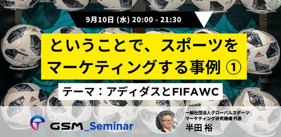 9月10日(水)20:00-21:30 (セミナー)【ということで、スポーツをマーケテイングする事例 ① 】事例紹介として、今回はアディダスとFIFAWCのお話詩をします。これは私が実際に担当して、5年間をかけてやり抜いた私の事例の紹介です。アディダスは当時、①大会の公式スポンサー権 ②大会...