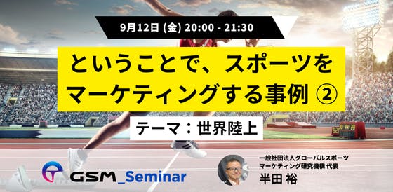 9月12日(金)20:00-21:30(セミナー)【ということで、スポーツをマーケテイングする事例 ②】今日は2025年9月13日(土)に開会される世界陸上をテーマにお話をしたいです。大阪大会以来18年ぶり、前回の東京以来34年ぶりの自国開催です。現在の協賛企業のブランドを取り上げて、グローバ...