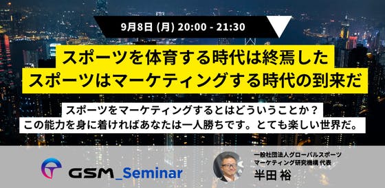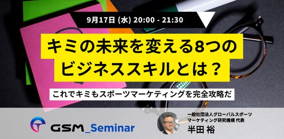 9月17日(水)20:00-21:30(セミナー)【キミの未来を変える8つのビジネススキルとは?これでキミもスポーツマーケティングを完全攻略だ】【プロのマーケターになるための8つのスキル】スポーツを体育する時代はもうとっくに終わっている。今の時代はスポーツをマーケティングする時代だ。日本に於い...