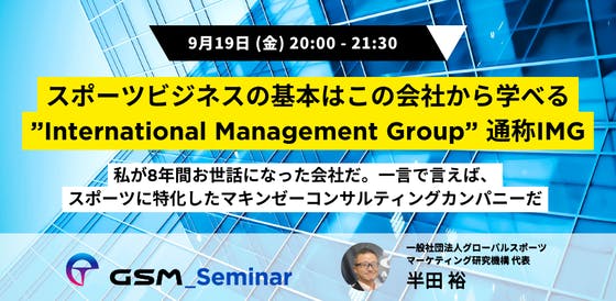 9月19日(金)20:00-21:30(セミナー)【スポーツビジネスの基本はこの会社から学べる。”International Management Group”、通称IMG。私が8年間お世話になった会社だ。一言で言えば、スポーツに特化したマキンゼーコンサルティングカンパニーだ】世界最大、かつも...