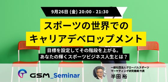 9月26日(金)20:00-21:30(セミナー)【スポーツの世界でのキャリアデベロップメント。目標を設定してその階段を上がる。あなたの輝くスポーツビジネス人生とは?】まず、スポーツビジネスと言ってもどのような仕事があるのか?分かりません。という基本的な疑問に答える事から始める。スポーツのビジ...
