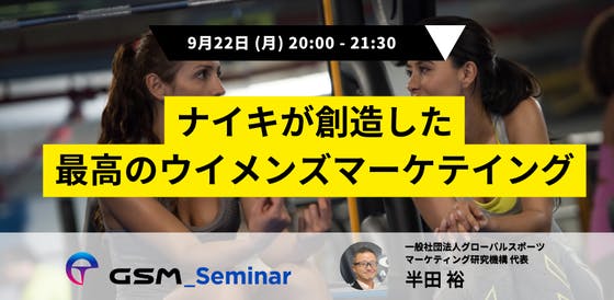 9月22日(月)20:00-21:30(セミナー)【ナイキが創造した最高のウイメンズマーケテイング】地球上には40億人近い女性が存在する。彼らも学校に通っていたころは授業の一環で色々なスポーツに従事していたはずだ。これは男性もそうだが、社会に出て会社員になった途端にその活動機会はガクンと落ちる...