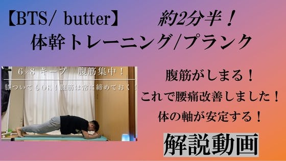 アイソレ専門オンラインサロンアイソレの神様/ダンスインストラクターのRyutaroです。BTS/butterの曲で2分半でお腹の引き締める体幹トレーニング/プランク動画になります。https://youtu.be/oJyMS4em6wAこちらの解説動画を500円にて販売しております。・腕のポジ...