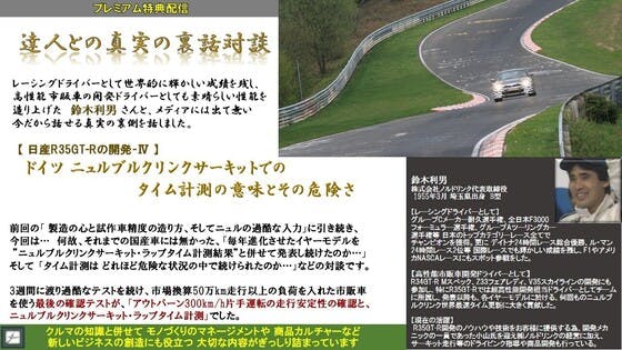 <コミュニティ特典映像>【達人との真実の裏話対談】鈴木利男さんとの対談…「日産R35GT-Rの開発-Ⅳ」ドイツ ニュルブルクリンクサーキットでのタイム計測の意味とその危険さ