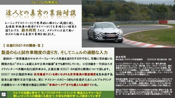 <コミュニティ特典映像>【達人との真実の裏話対談】鈴木利男さん対談…「日産R35GT-R開発-Ⅲ…製造の心と試作車精度の造り方、そしてニュルの過酷な入力で鍛えた"恒久な価値"」