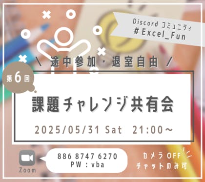 現時点での勉強会スケジュールです♪最新情報はDiscordコミュニティ内でご確認ください!\ 参加者760名突破 /▼ Excel-Fun.xls* / Discordhttps://sites.google.com/view/excel-vba-fun-campfire