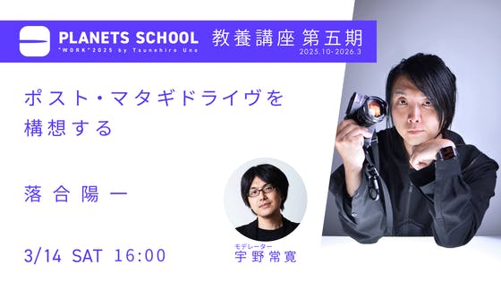 2025年10月から2026年3月にかけて、「PLANETS SCHOOL 教養講座」の第五期を開催します!「PLANETS SCHOOL 教養講座」は、僕(宇野)と一緒に、いま本当に身につけておきたい学問の入り口をノックして、学び始めるための講座です。※講座内容は変更することがあります。(敬...