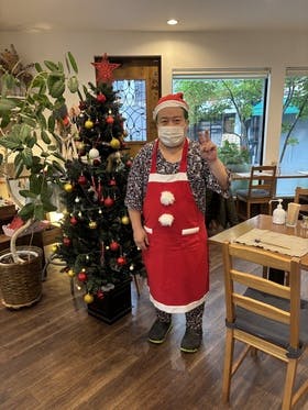 ぴあキッチンのクリスマスはみっちゃんがサンタクロースに扮してお出迎えしてくれます。張り切っているみっちゃんは髪の毛をグリーンに染めているのだ。