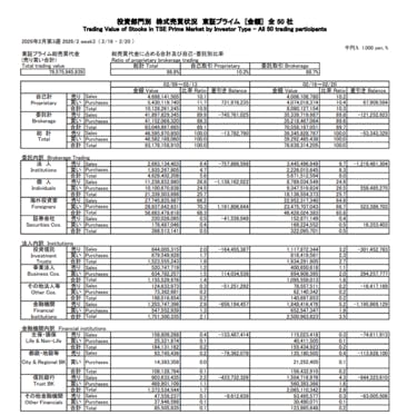 週間騰落=225:-0.20%、TOPIX:-0.27%。 ・自己=+688億円、2週連続買い越し(現物+750億/先物-62億) ・海外投資家=-520億円、3週ぶり売り越し(現物+5427億/先物-5947億)・信託=-6274億円、7週連続売り越し(現物-9516億/先物+3242億...