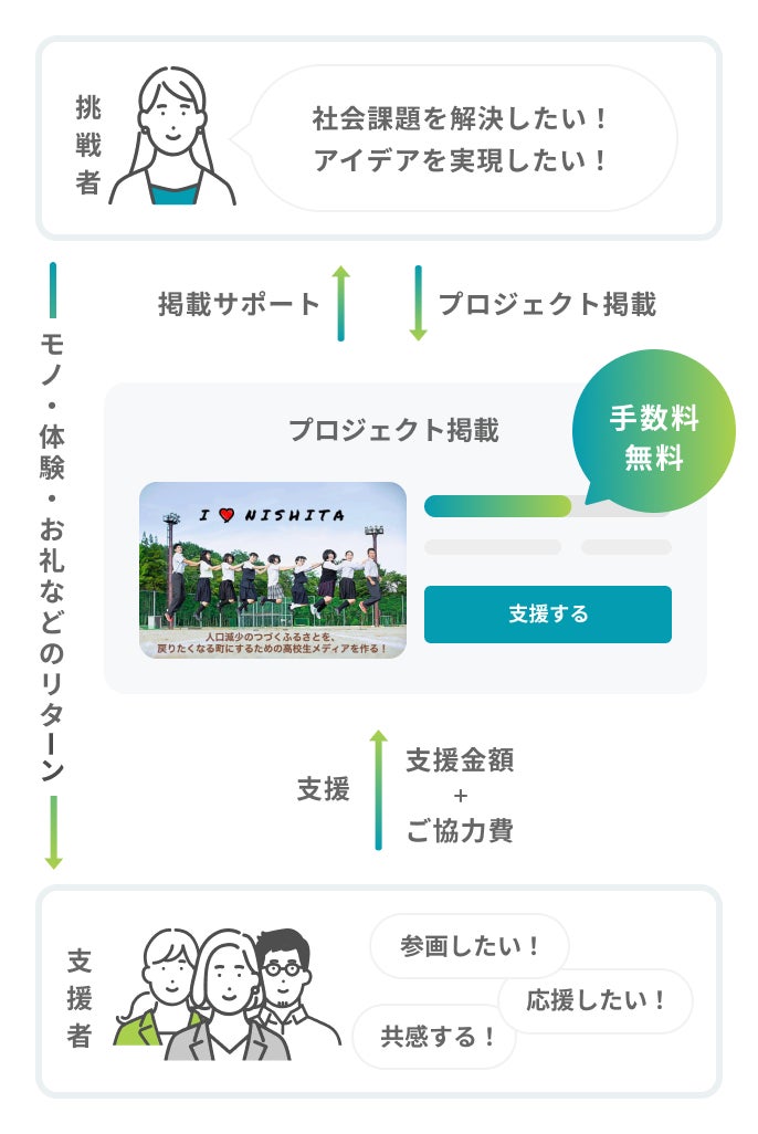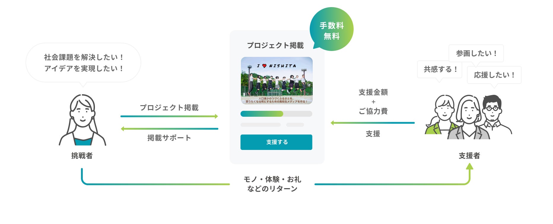 社会課題の解決に取り組むプロジェクトオーナーに1円でも多くの寄付を届けるため、プロジェクトオーナーのご負担を0円とし、支援者さまからのご協力とCAMPFIRE利用者の支えにより運営しています。