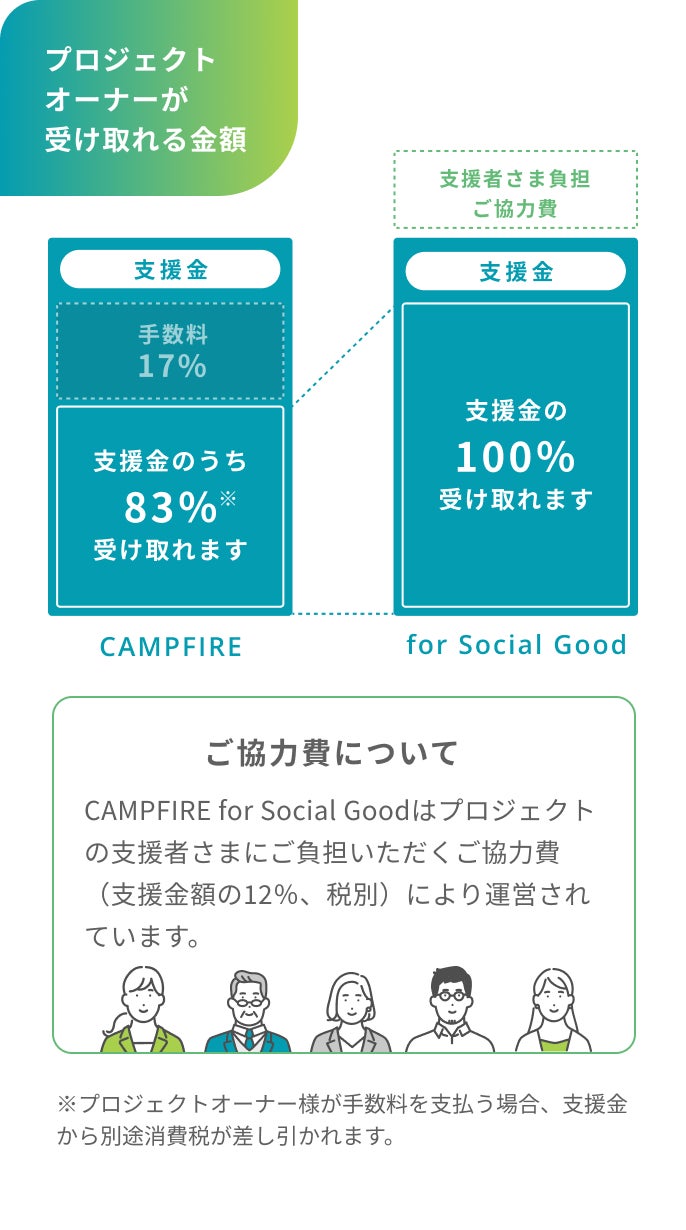 手数料は0円。集まった支援金は100%受け取ることができます。CAMPFIRE for Social Goodは支援者さまにご負担いただくご協力費により支えられています。