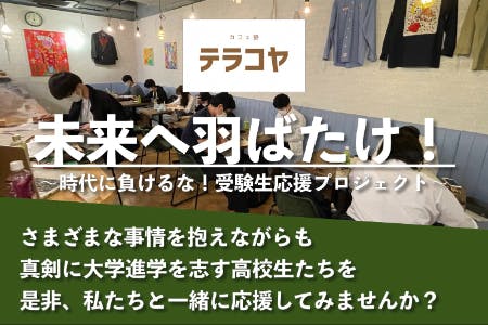 経済的な理由で安心して勉強出来ない学生たちを何とかしたい!という思いから、カフェをお借りして無料で勉強出来る「カフェ塾テラコヤ」を運営しています。私たちと一緒に...