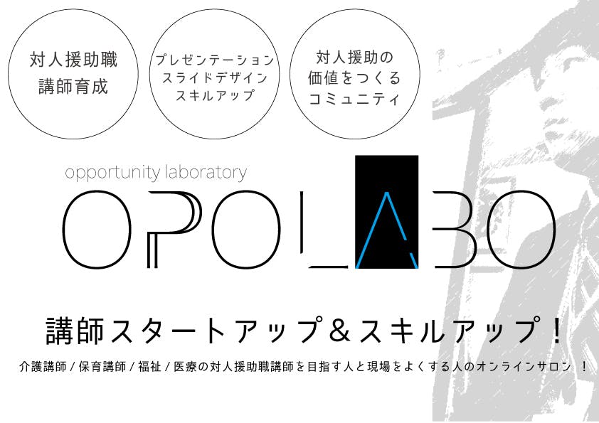 OPOLABOは介護職をはじめとした対人援助職(保育職/福祉職等)が「その仕事」を続けながら,講師Tとしてなって発信していきたい人を育成すること,プレゼンスキル...