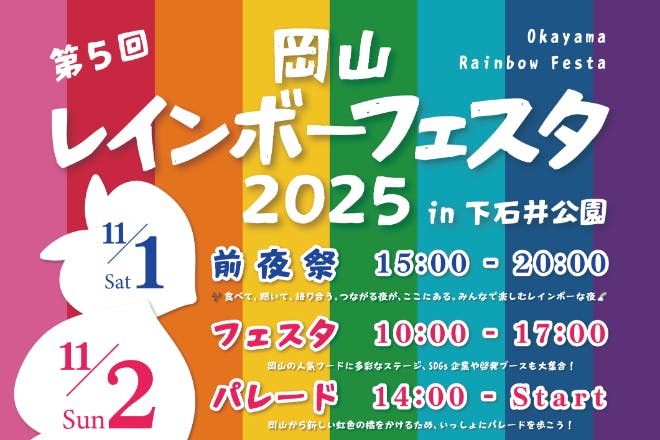 私たち「ももにじ岡山」は、晴れの国・岡山県で『岡山レインボーフェスタ』を毎年開催し、昨年も大盛況で終えることができました。今年は11月1日(土)に前夜祭、11月...