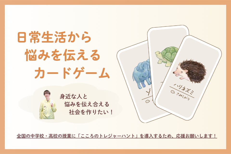 「こころのトレジャーハント」は身近な人と日常生活から悩みを自然に伝え合える社会を目指したカードゲームです。全国の中高の授業にゲームを導入し、誰もが悩みを話せる相...