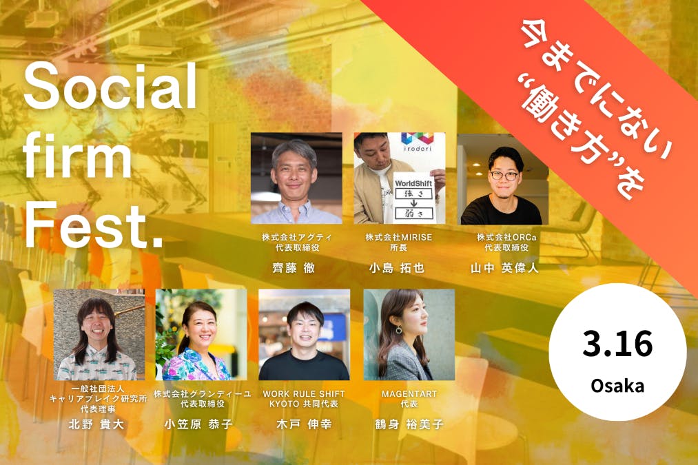 今までにない働き方に出会えるイベント「Social firm Fest.」が、3月16日(日)に大阪・新今宮で開催! 革新的な働き方やキャリア選択を実現する...