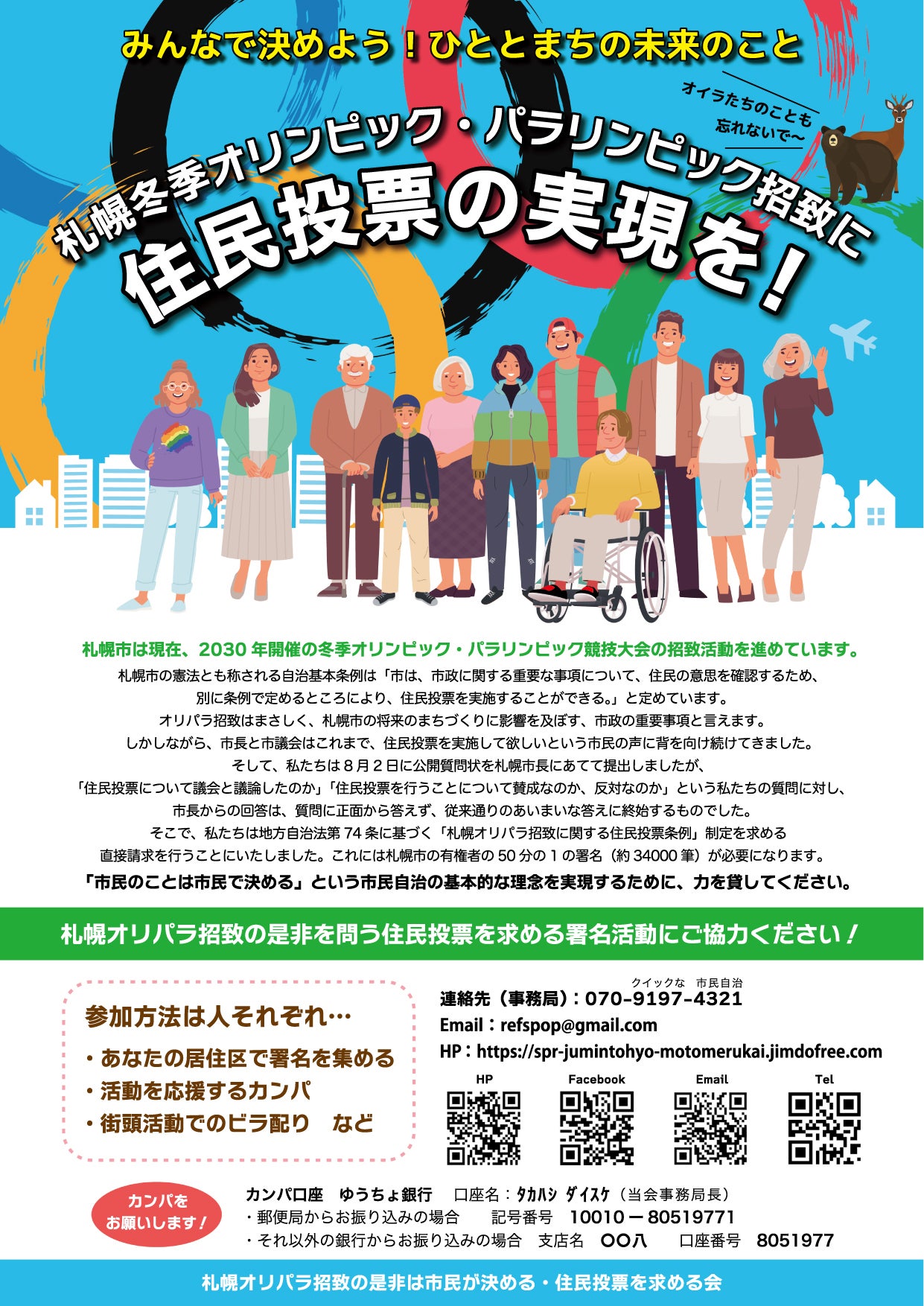 当会は10月30日付で住民投票条例の直接請求運動を終了することになりました。 <理由> ①札幌オリパラ招致について2030年も2034年も可能性が極めて低くなっ...