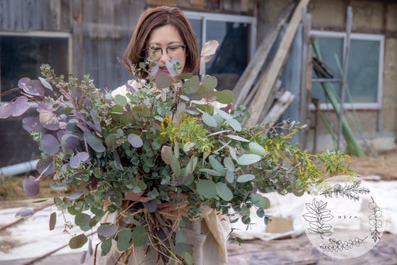 今は耕作放棄地の畑には、崩れかけの小屋が残っています。この場所を守るため小屋をアトリエ(作業場)に造り替え、畑ではユーカリ中心とした多種目の花木類の育てる事にし...