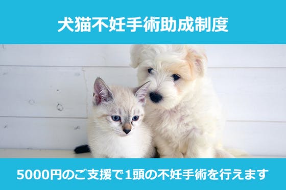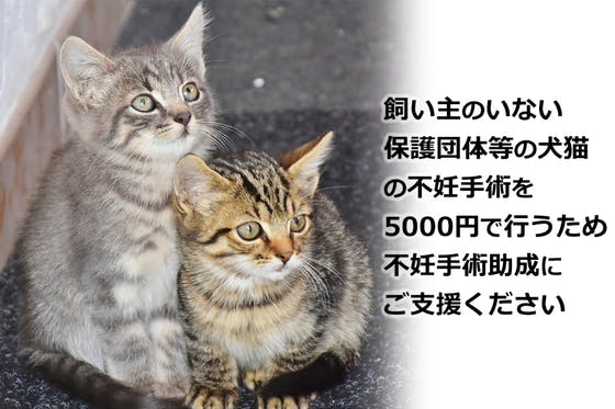 飼い主様のいない、保護団体などが保護している犬猫に対して、1頭あたり5000円のご負担金で不妊手術を行える「不妊手術助成制度」へのご支援をお願いいたします。不妊...