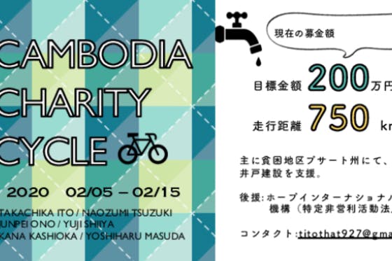 カンボジアの郊外に位置する村々に井戸を設置して周ります。設置するだけでなく、自転車でカンボジアを一周する事で現地の実情をより正確に把握し、設置します。学生のみの...