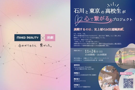 2024/11/24に、石川県と東京都の高校生で史上初「遠隔演劇」を実現予定。石川県立七尾東雲高等学校での公演とオンライン配信予定。XR(拡張現実)やMR技術を...