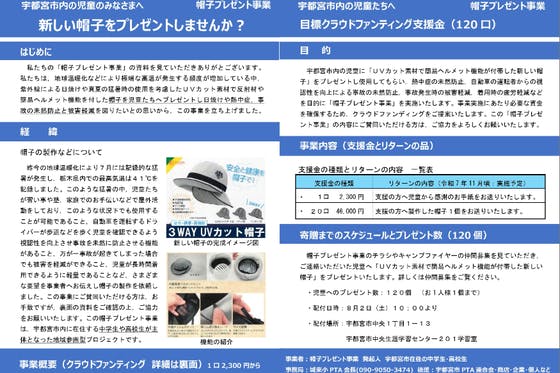 「簡易ヘルメット機能が付帯した新しい帽子」を宇都宮市内の小学校児童へ配付して,帽子を着用してもらい児童の熱中症や交通事故の防止することを目的としています。