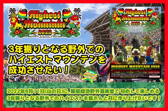 今年24年目を迎える日本最大級のレゲエフェス「ハイエストマウンテン」が、8月11日(山の日)に服部緑地野外音楽堂で、3年振りの野外での開催となります。入場者を制...