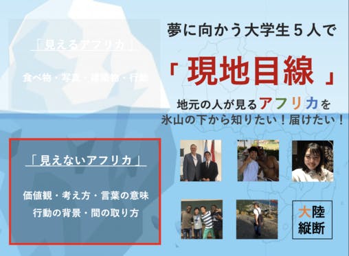 日本では分からない、氷山の下に隠れた「アフリカの目には見えない文化」って何だろう?僕らはそんな疑問に駆り立てられ今回のプロジェクトに至りました。今まで別々のフィ...