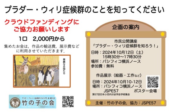 JSPE57(第57回日本小児内分泌学会学術集会)@パシフィコ横浜ノースにおいて, PWS(プラダーウィリ症候群)という病気を広く理解してもらうために, ①ポスター会場でPWS患者さんの絵画・工作など作品を展示します ②2024/10/12(土)夕方,PWSに関する市民公開講座を実施します. そのための経費をクラウドファンディングで集めたいと思います.