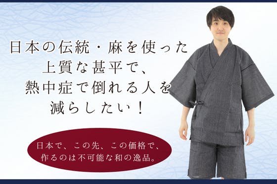 他クラウドファンディングで260万円以上も集まった快適甚平。すでにシーズンは過ぎましたが来年の夏にいかがでしょうか?希少麻を使った快適甚平が販売開始!