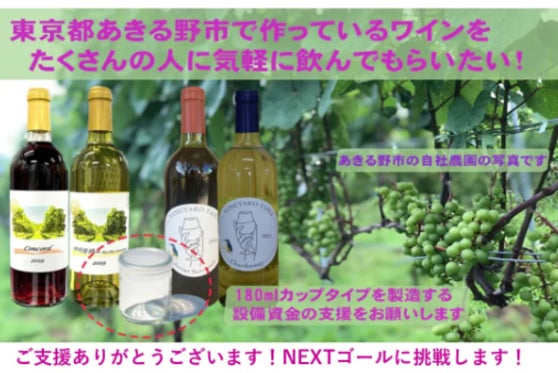 東京都あきる野市産のぶどうで作るワインがあることを多くの方に知っていただけるよう、手軽にご購入いただけるカップワインを製造したいと思っています。自然豊かなあきる...