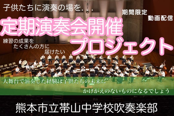 私たちは熊本市立帯山中学校吹奏楽部です。コロナの影響で練習の成果を披露する場をたくさん失っています。今年も定期演奏会だけは開催したい!たくさんの方に音を届けたい...