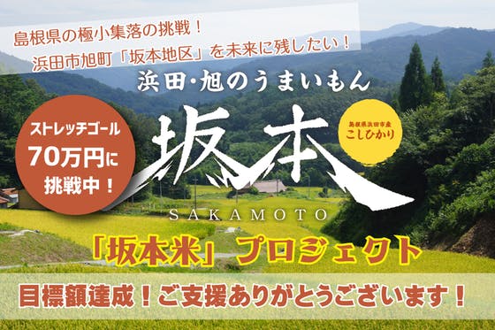 中国山地の麓に位置する浜田市旭町坂本地区を未来に残していくため、ここでできた地域ブランド米を全国に届けて支援の輪を広げます。「坂本米で地域を守りたい!」坂本米プ...
