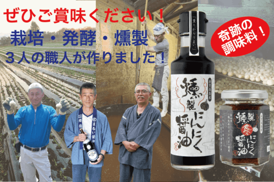 にんにく栽培農家である「よこいファーム」と、燻製加工職人である「スモーク工房杣人」、そして、地域の老舗醤油メーカーである「有限会社岩佐商店」の3人の職人の技で、...