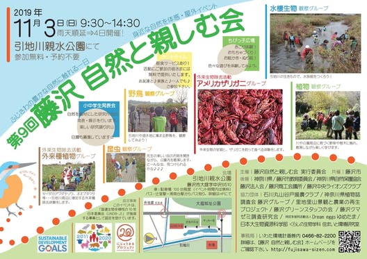 私たち【藤沢 自然と親しむ会】は、子ども達が自然観察を通して自然とのふれあい、環境保全の大切さを体験してもらうイベントを藤沢市引地川親水公園で毎年秋に開催してい...