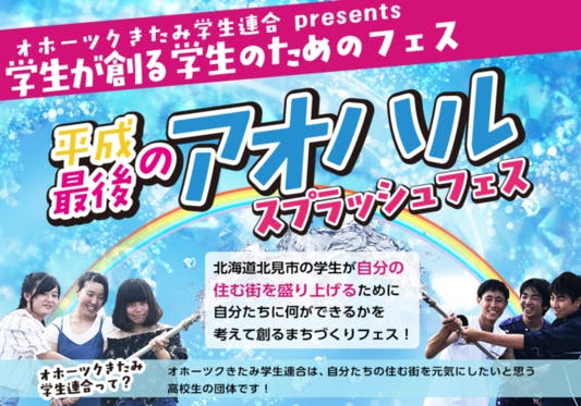 〇イベント名:「平成最後のアオハル!!~スプラッシュフェス~」 〇日時:平成30年8月12日(日曜日)11:00~16:00 〇場所:北見市芸術文化ホール前多目...