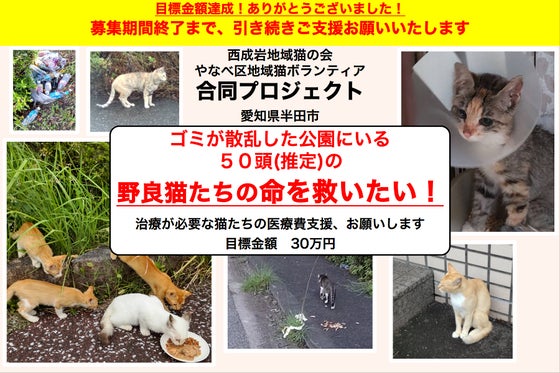 半田西成岩地区地域猫の会/やなべ区地域猫ボランティア 愛知県半田市で活動している地域猫活動のNPO(市民団体)です。 飼い主のいない野良猫に避妊去勢手術をし、地域猫として適切に管理しています。 仔猫・怪我や病気の猫は保護し、治療後に里親募集も行っています。 中には緊急手術・入院が必要な場合もあり、多額の医療費がかかっています。 かかった医療費は明細原本と共にウェブサイトで公開しています。 猫の命を救うため、皆様のご支援をよろしくお願いいたします。