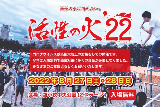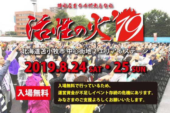 北海道最大級の野外音楽フェス『活性の火’18』を2018年8月25~26日、苫小牧駅前各所にて開催します!アーティストやアマチュアバンドをゲストに、昨年では30...