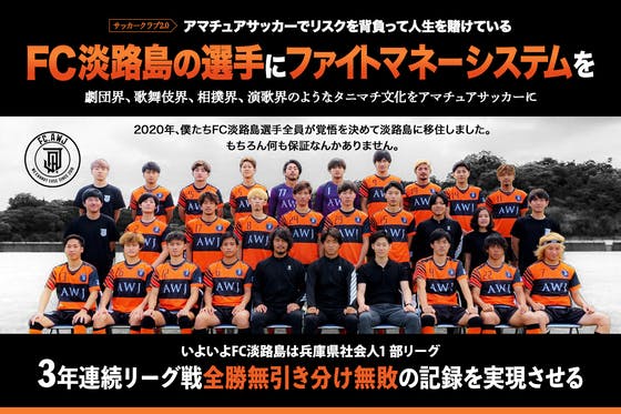 おかげ様で前回のクラファンで有言実行!創立1年半で全国制覇することができました。ありがとうございます。FC淡路島7年でJリーグ昇格、負けたら撤退!2020年度兵...