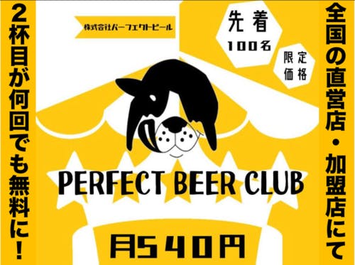 全国の"パーフェクトビール"直営店と加盟店で2杯目のパーフェクトビールが"何回でも無料!!" になる、ファンクラブ会員を募集をします!その他、各店舗のお得な情...