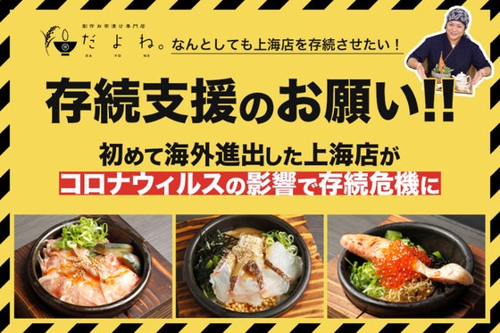 「創作お茶漬け専門店だよね。」はコロナ禍で、 海外に出店した上海店の存続危機に見舞われています。 日本の伝統”お茶漬け”を世界に発信し続けるため、そして、上...