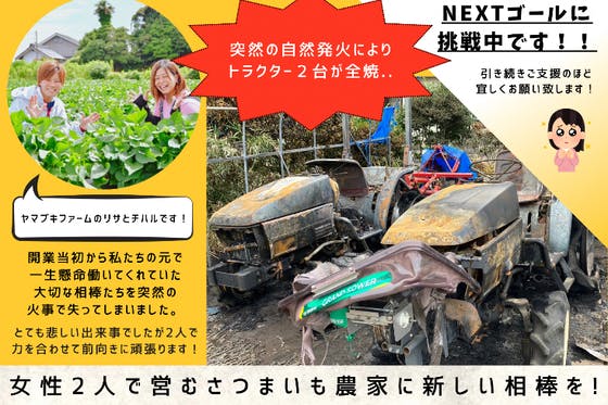 2人で夢を叶えて開業して3年目。トラクター2台が、突然バッテリーの自然発火により全焼しました。開業当初に必死に貯めたお金で購入した大切な相棒たちを失い、悲しくて...